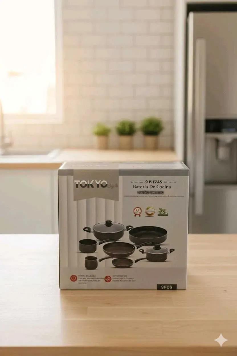 Batería de 5 Piezas: Incluye un jarro con tapa de 18 cm, una cacerola con tapa de 24 cm y un sartén de 24 cm.